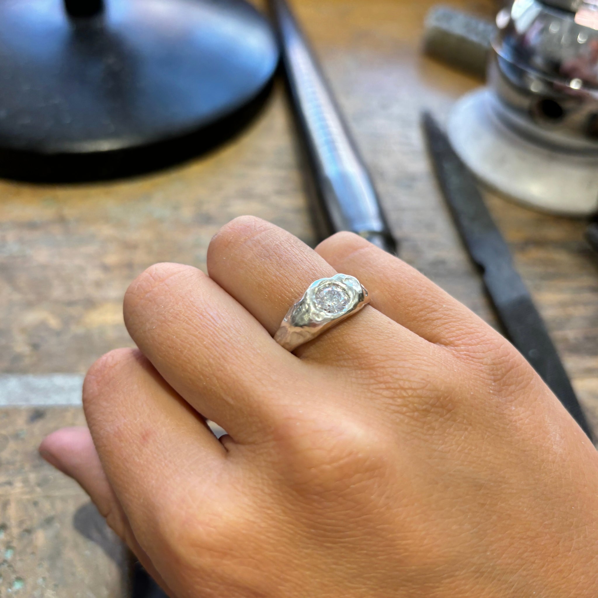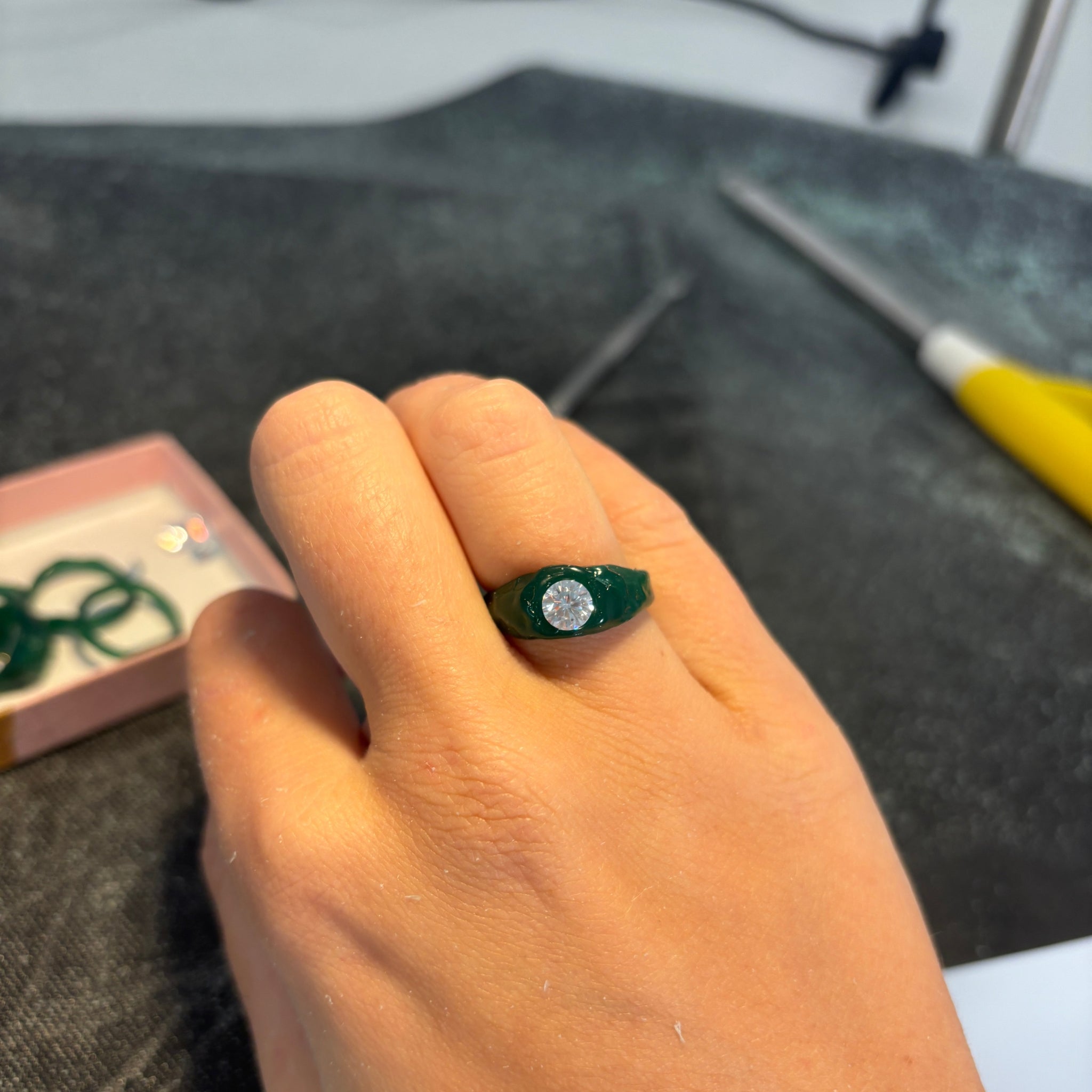 Every piece is made end to end by me! For particularly complex designs, I collaborate with a professional setter, but I primarily set stones myself.